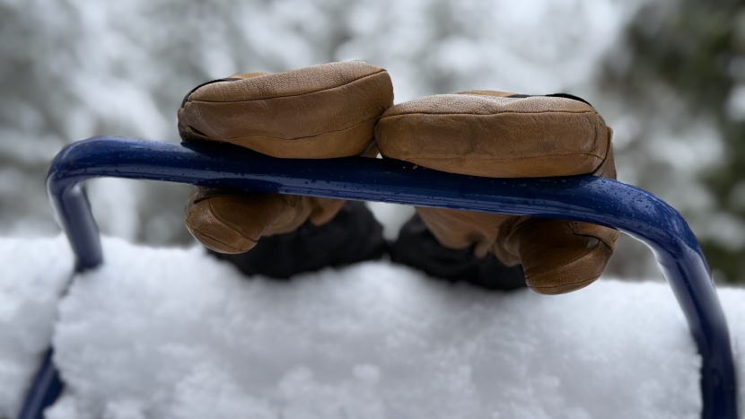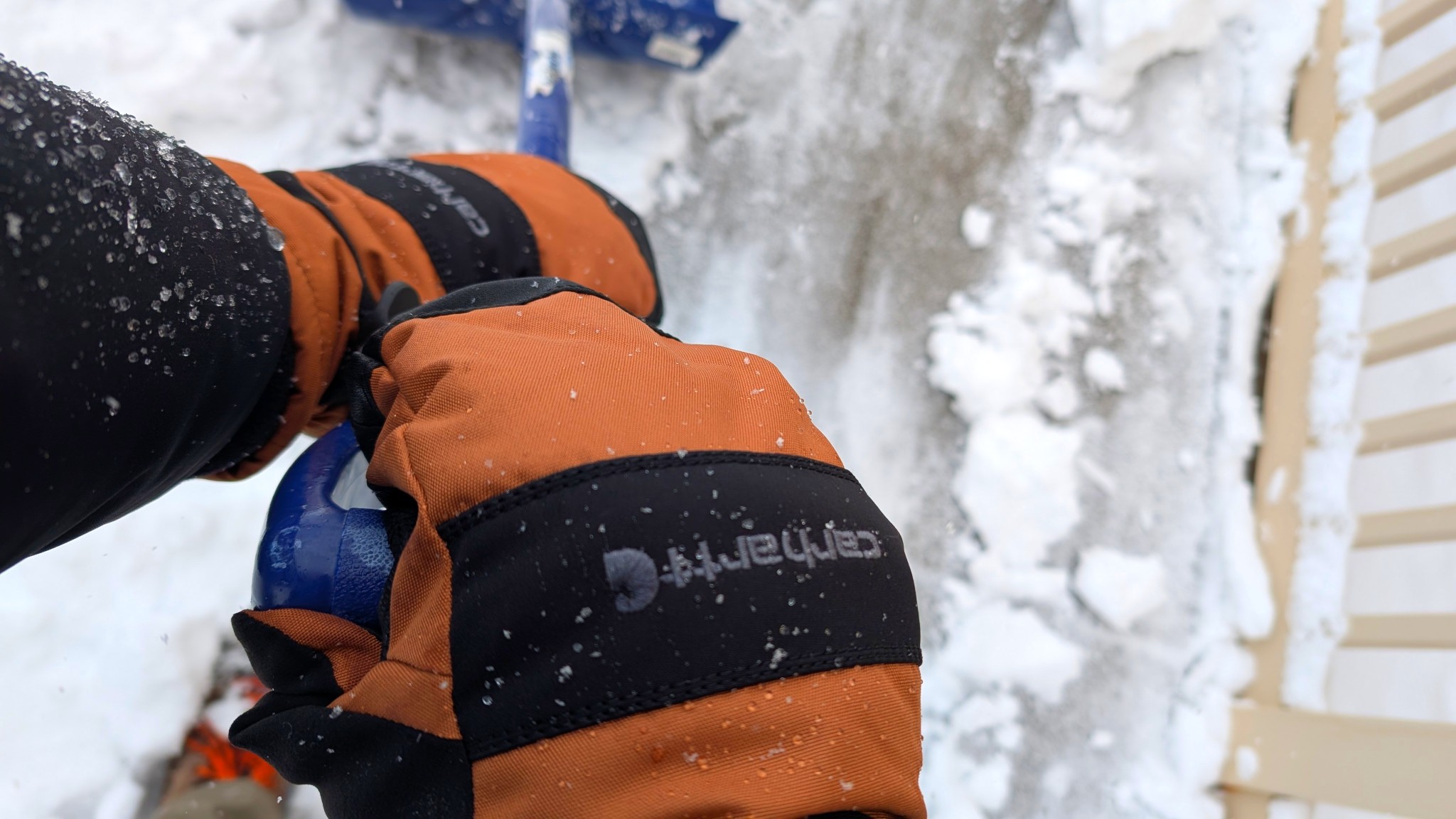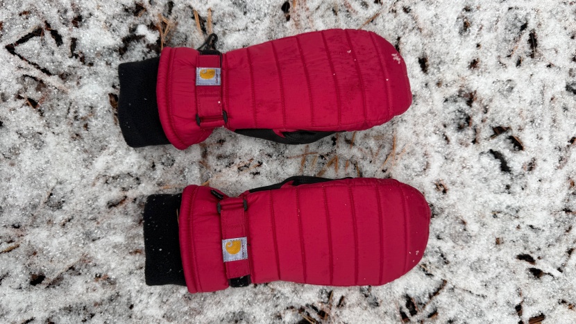 The Quilted Carhartt gloves are mostly waterproof and work well enough for extended time in the snow. Credit: Clark Tate