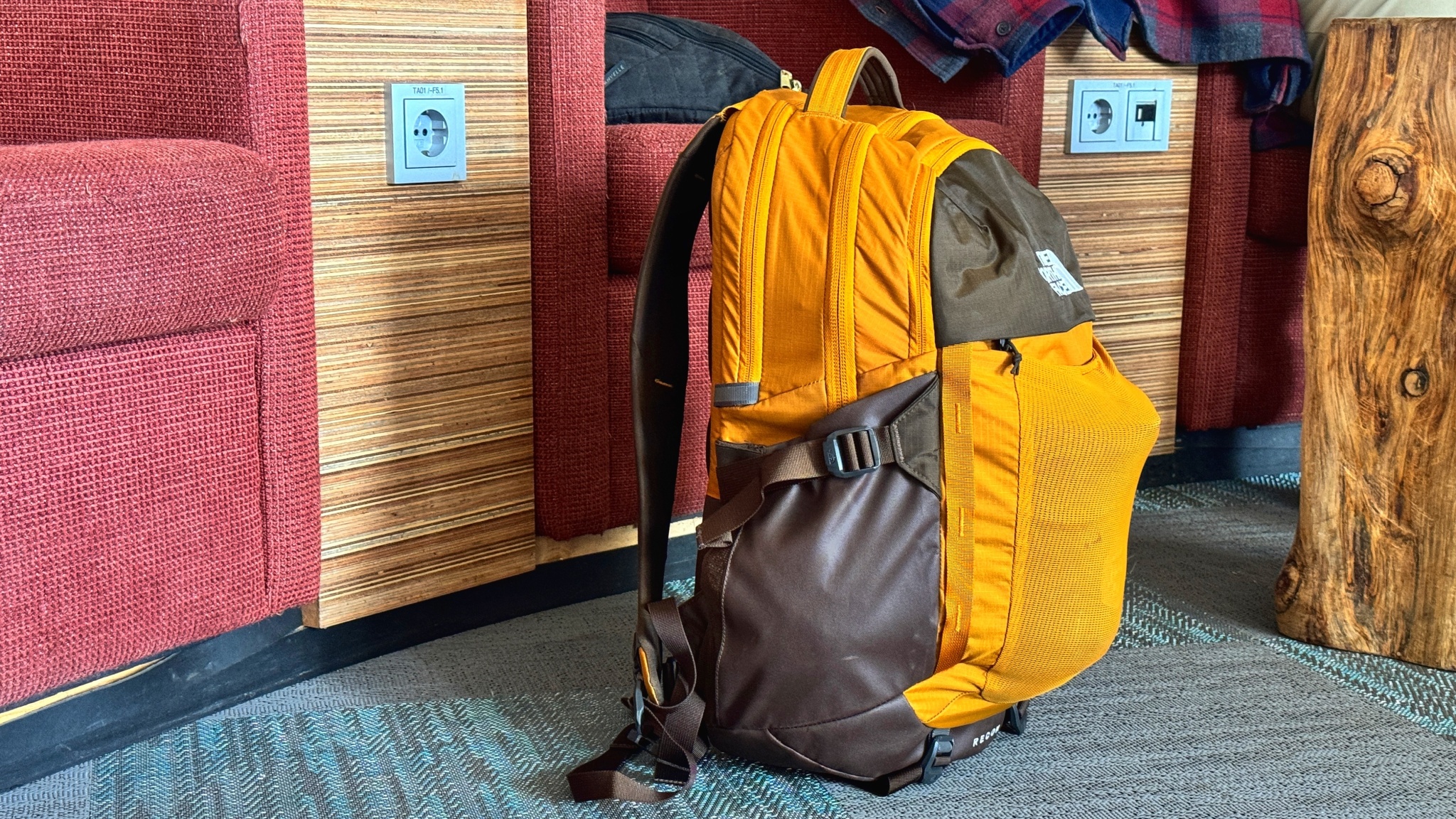 The TNF Recon easily stands upright even fully loaded with a month's worth of work and travel-related gear. This level of stability makes it easier to get things in and out while working from an airport lounge, like this one in Iceland's Keflavík airport. Credit: Maggie Nichols